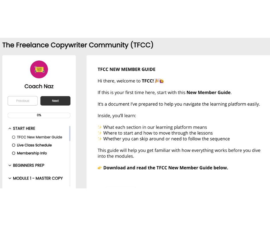 TFCC is not a basic "What is copywriting?" type of course. It’s best suited for those who already know the fundamentals and are actively trying to improve . Maybe you've taken a course, watched YouTube videos, written a few copy, or tried to get your first client.